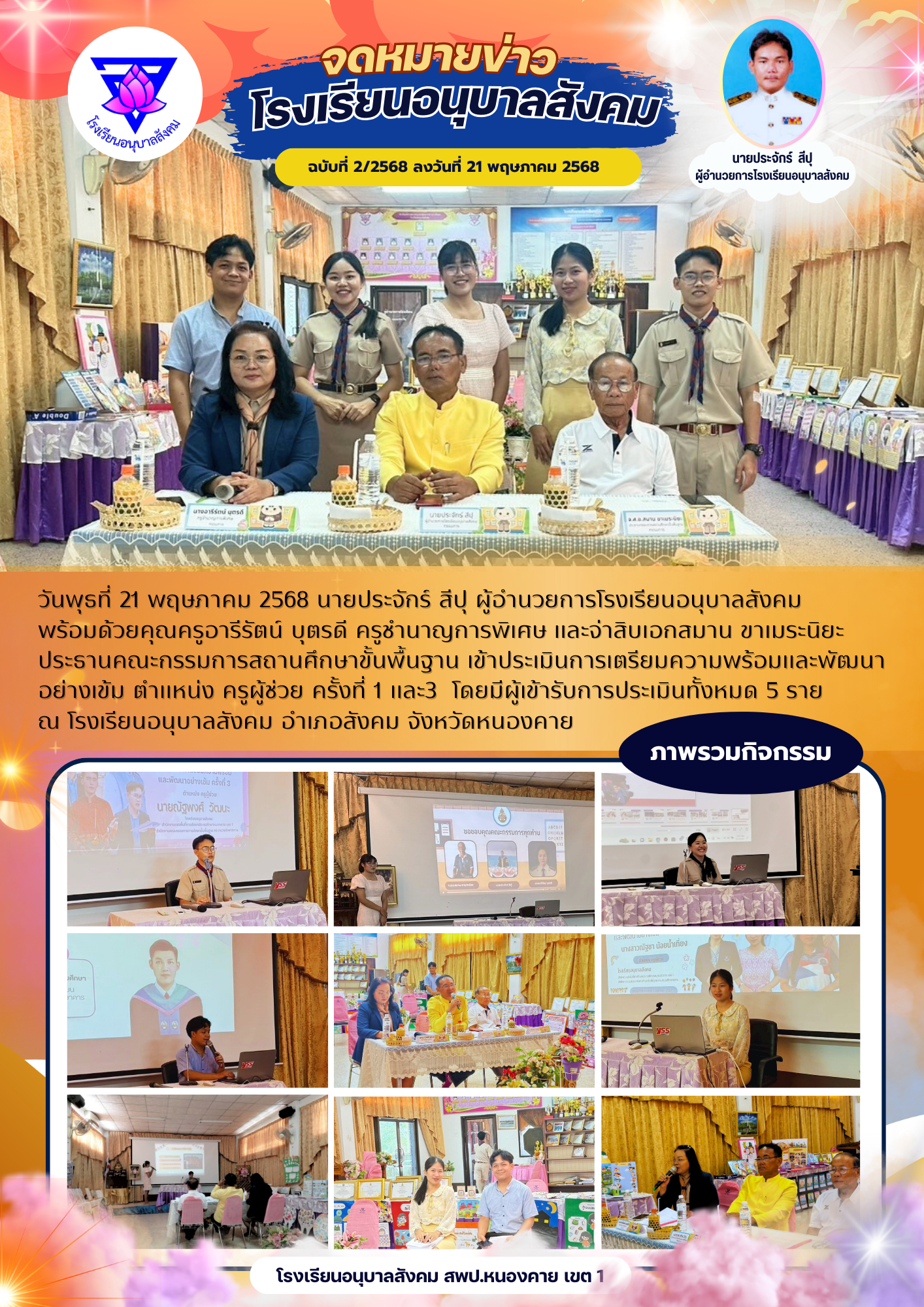 วันพุธที่ 21 พฤษภาคม 2568 นายประจักร์ สีปุ ผู้อำนวยการโรงเรียนอนุบาลสังคม พร้อมด้วยคุณครูอารีรัตน์ บุตรดี ครูชำนาญการพิเศษ และจ่าสิบเอกสมาน ขาเมระนิยะ ประธานคณะกรรมการสถานศึกษาขั้นพื้นฐาน เข้าประเมินการเตรียมความพร้อมและพัฒนาอย่างเข้ม ตำแหน่ง ครูผู้ช่วย ครั้งที่ 1 และ 3 โดยมีผู้เข้ารับการประเมินทั้งหมด 5 ราย ณ โรงเรียนอนุบาลสังคม อำเภอสังคม จังหวัดหนองคาย