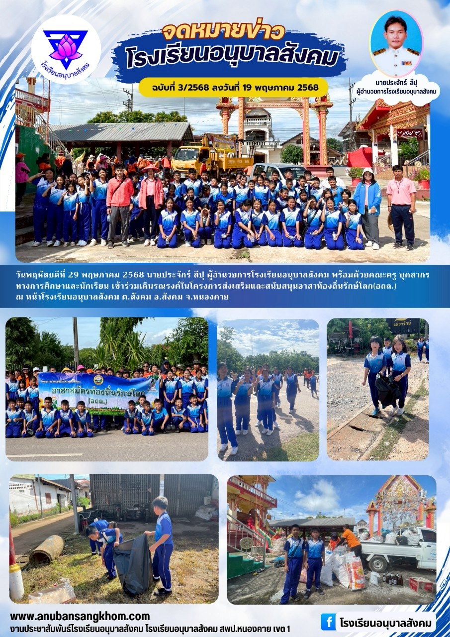 วันพฤหัสบดีที่ 29 พฤษภาคม 2568 นายประจักร์ สีปุ ผู้อำนวยการโรงเรียนอนุบาลสังคม พร้อมด้วยคณะครู บุคลากรทางการศึกษาและนักเรียน เข้าร่วมเดินรณรงค์ในโครงการส่งเสริมและสนับสนุนอาสาท้องถิ่นรักษ์โลก ณ หน้าโรงเรียนอนุบาลสังคม ต.สังคม อ.สังคม จ.หนองคาย