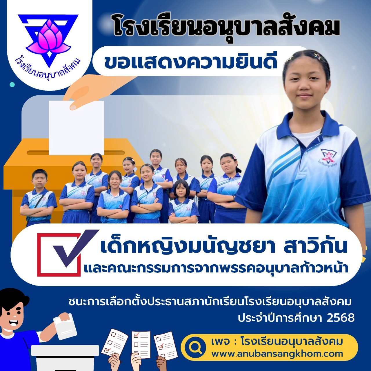30 พฤษภาคม 2568 โรงเรียนอนุบาลสังคม จัดกิจกรรมเลือกตั้งประธานสภานักเรียน ปีการศึกษา 2568 เพื่อส่งเสริมประชาธิปไตยในสถานศึกษา ผลการเลือกตั้งประธานสภานักเรียน ได้แก่ พรรคอนุบาลก้าวหน้า เด็กหญิงมนัญชยา สาวิกัน (นาเดียร์)ได้เป็นประธานสภานักเรียนโรงเรียนอนุบาลสังคม ประจำปีการศึกษา 2568 ทางโรงเรียนของแสดงความยินดีไว้โอกาสนี้ ณ หน่วยเลือกตั้งประธานนักเรียนโรงเรียนอนุบาลสังคม อ.สังคม จ.หนองคาย
