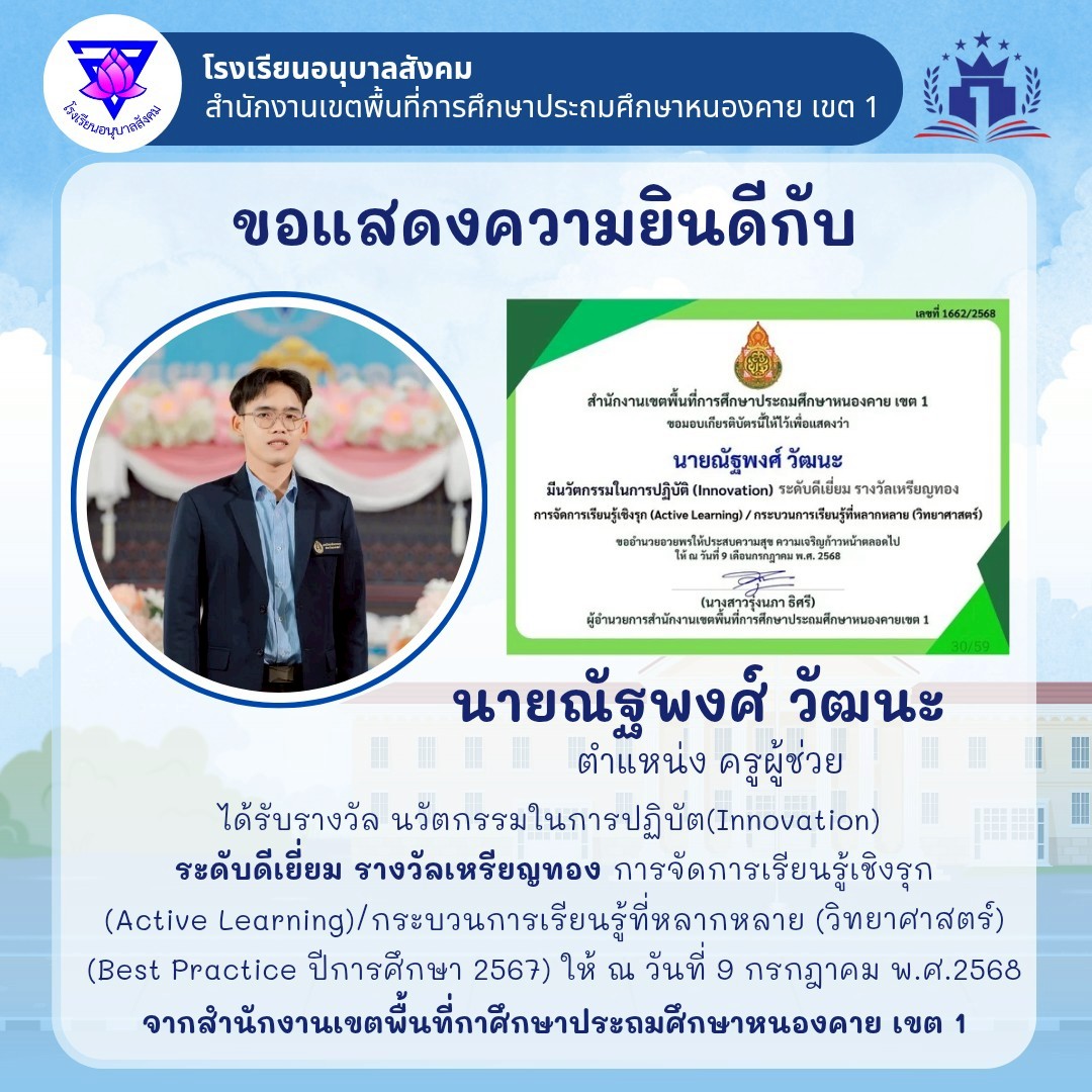 ได้รับรางวัล นวัตกรรมในการปฏิบัต (Innovation)ระดับดีเยี่ยม รางวัลเหรียญทอง การจัดการเรียนรู้เชิงรุก(Active Learning)/กระบวนการเรียนรู้ที่หลากหลาย (วิทยาศาสตร์)