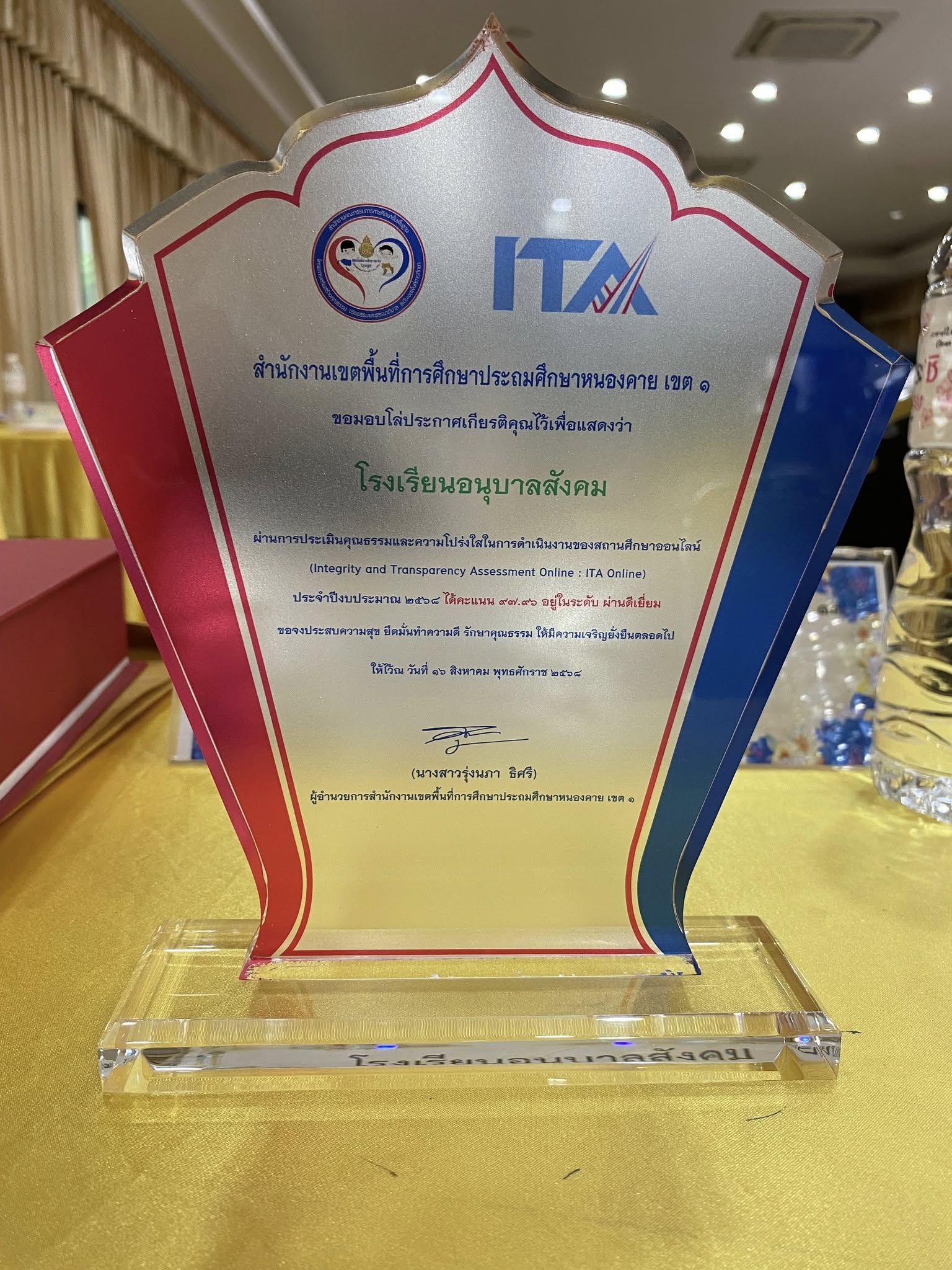 วันพุธที่ 20 สิงหาคม พ.ศ.2568 เวลา 09.00 น. นายประจักร์ สีปุ ผู้อำนวยการโรงเรียนอนุบาลสังคม เข้าร่วมประชุมการพัฒนาประสิทธิภาพในการบริหารจัดการศึกษา ครั้งที่ 8/2568 สำหรับผู้บริหารสถานศึกษาในสังกัด โดยเน้นย้ำในการปฏิบัติตามนโยบายของรัฐมนตรีว่าการกระทรวงศึกษาธิการ “เรียนดี มีคุณธรรม” และสำนักงานคณะกรรมการการศึกษาขั้นพื้นฐาน กำหนดจุดเน้นเรื่องการเสริมสร้างความสุขและความปลอดภัยของสถานศึกษา การขับเคลื่อนโครงการ 1 อำเภอ 1 โรงเรียนคุณภาพ พร้อมมอบนโยบายจุดเน้นของสำนักงานเขตพื้นที่การศึกษาประถมศึกษาหนองคาย เขต 1 และรับโล่รางวัล ITA 2025 ระดับดีเยี่ยม จากการประเมินคุณธรรมและความโปร่งใสในการดำเนินงานของสถานศึกษาออนไลน์ (ITA Online) ประจำปีงบประมาณ พ.ศ. 2568 ณ ห้องประชุมสามัคคีเนรมิต สำนักงานเขตพื้นที่การศึกษาประถมศึกษาหนองคาย เขต 1