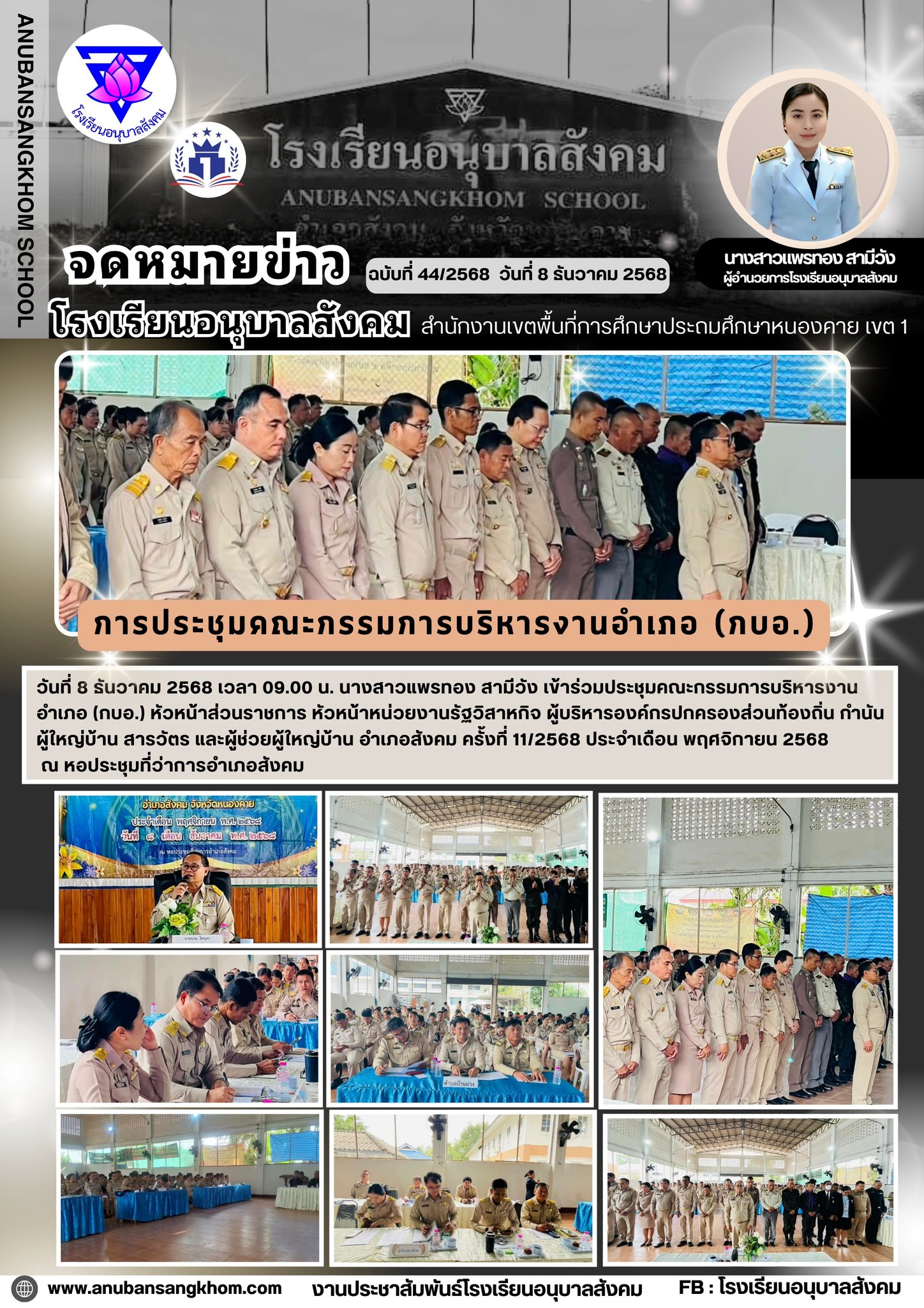 ร่วมประชุมคณะกรรมการบริหารงานอำเภอ (กบอ.) หัวหน้าส่วนราชการ หัวหน้าหน่วยงานรัฐวิสาหกิจ ผู้บริหารองค์กรปกครองส่วนท้องถิ่น กำนัน ผู้ใหญ่บ้าน สารวัตร และผู้ช่วยผู้ใหญ่บ้าน อำเภอสังคม